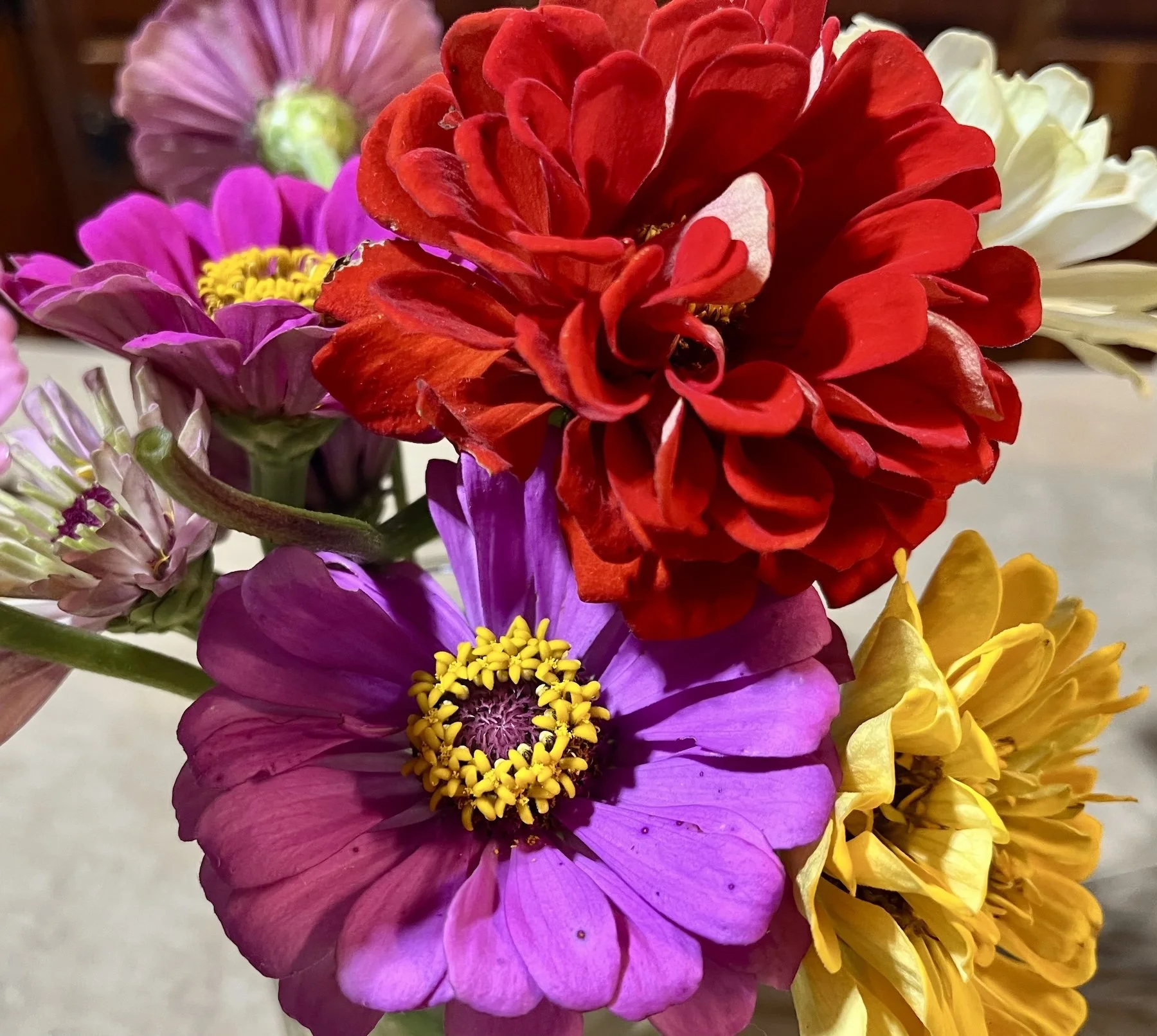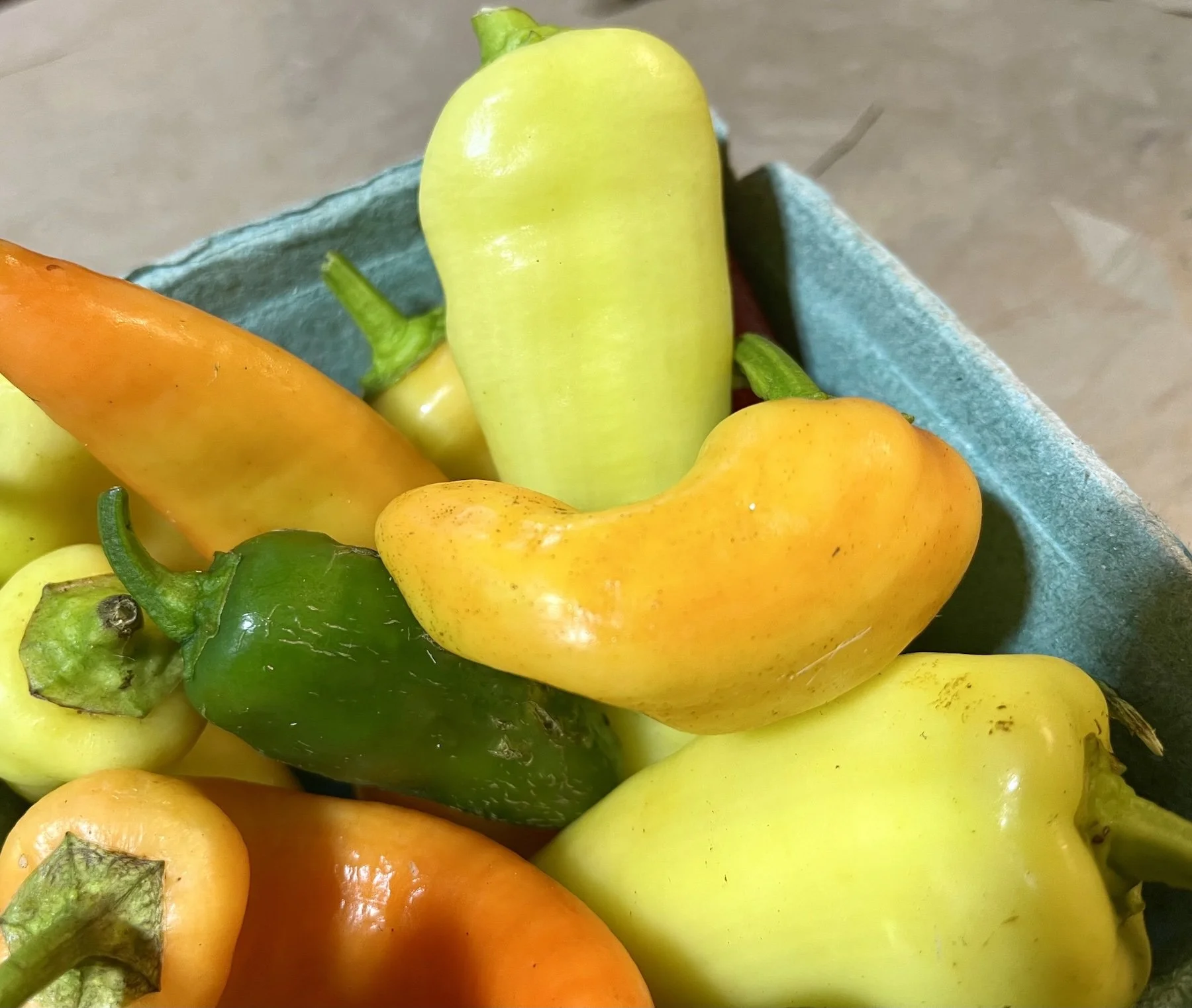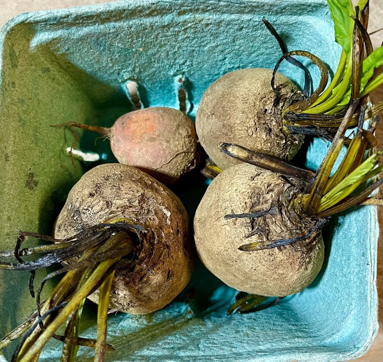 Zinnias, peppers, potatoes, cucumbers, tomatoes, golden beets and more are being harvested and taken to the weekly market. The heavy rains earlier gave the weeds a good jumpstart so finding the produce amongst them is a little like an egg hunt at Easter.